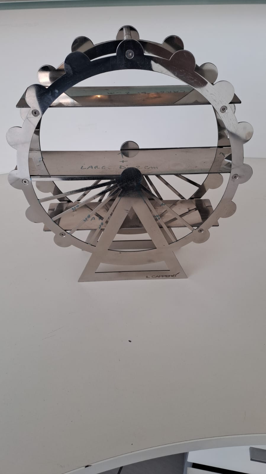 • alzata per dolci o salati  giostra  panoramica è realizzato in robusto materiale in acciaio inossidabile, resistente,composto a 3 ripiani assemblabili, di misure ripiano: larghezza 7 cm lunghezz 27 cm .altezza totale: espositore 36 cm larghezza totale: 33cm .antiruggine e riutilizzabile.